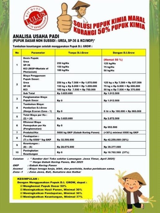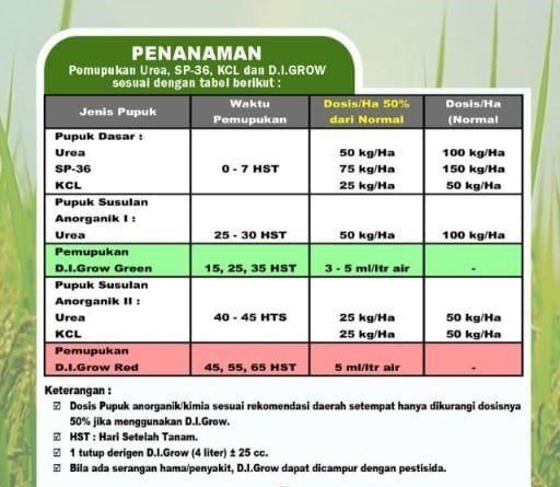 Dosis Pupuk anorganik/kimia sesuai rekomendasi daerah setempat hanya dikurangi dosisnya 50% jika menggunakan D.I.Grow
