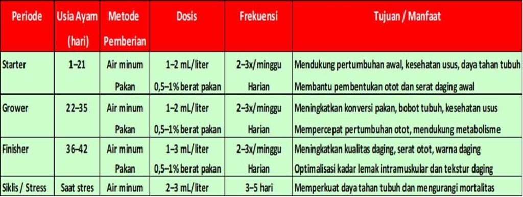 - Periode grower (hari 22–35): meningkatkan efisiensi pakan, pertumbuhan otot, dan bobot karkas.