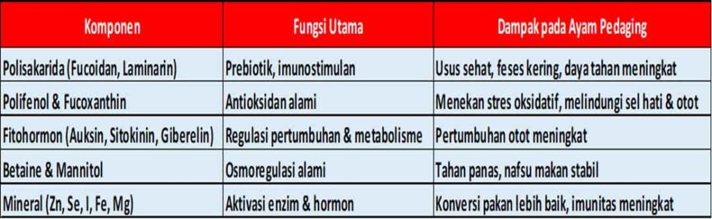 Kombinasi prebiotik, probiotik, mineral laut, vitamin, dan betaine mendukung usus sehat, meningkatkan mikrobiota, menekan patogen, memperkuat metabolisme dan daya tahan terhadap panas, menurunkan stres oksidatif, serta meningkatkan efisiensi protein dan kualitas daging.