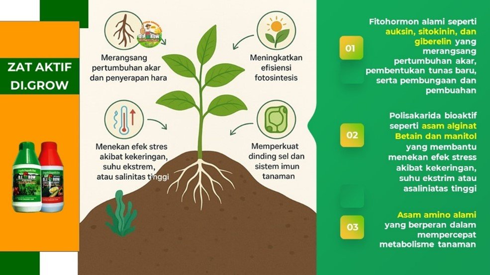 DI.GROW tidak hanya memberikan nutrisi lengkap, tetapi juga mempengaruhi mekanisme internal tanaman agar dapat bekerja lebih efisien. DI.GROW mengandung berbagai fitohormon alami seperti auksin, sitokinin, dan giberelin, serta betain, polisakarida, asam alginat, manitol, dan mineral organik. Kandungan ini menjadikan DI.GROW sebagai salah satu biostimulan paling lengkap dan efektif.