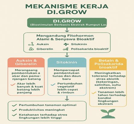 Fitohormon di dalam DI.GROW bekerja mengatur pertumbuhan dan diferensiasi sel tanaman. Auksin dan giberelin merangsang pembentukan akar serta pemanjangan batang, sementara sitokinin mempercepat pembentukan tunas dan daun baru. Selain itu, senyawa betain dan polisakarida bioaktif berperan penting dalam membantu tanaman mengatasi stres abiotik seperti kekeringan, salinitas, dan suhu ekstrem.