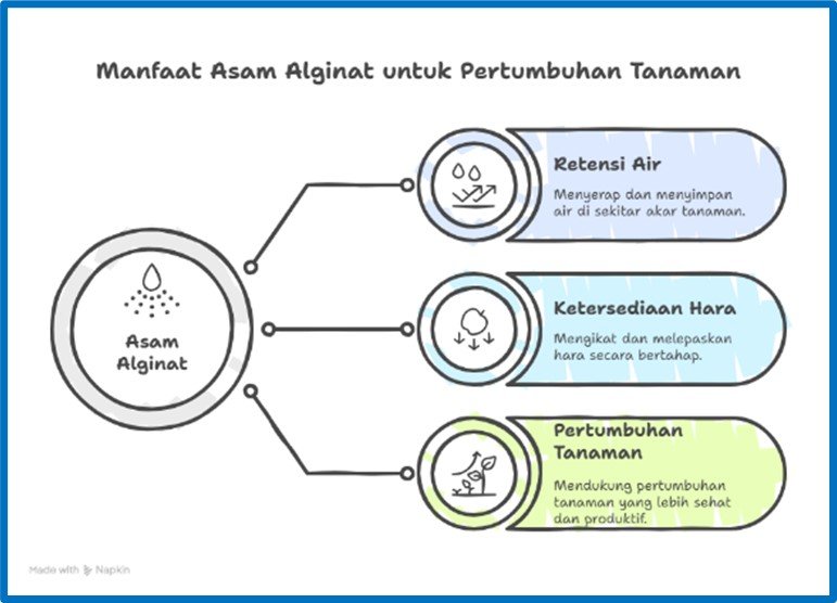 Kombinasi kemampuan menyimpan air dan mengatur ketersediaan hara menjadikan asam alginat sebagai solusi alami untuk mendukung pertumbuhan tanaman yang lebih sehat, produktif, dan tahan terhadap kondisi lingkungan yang kurang ideal.