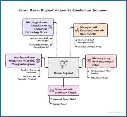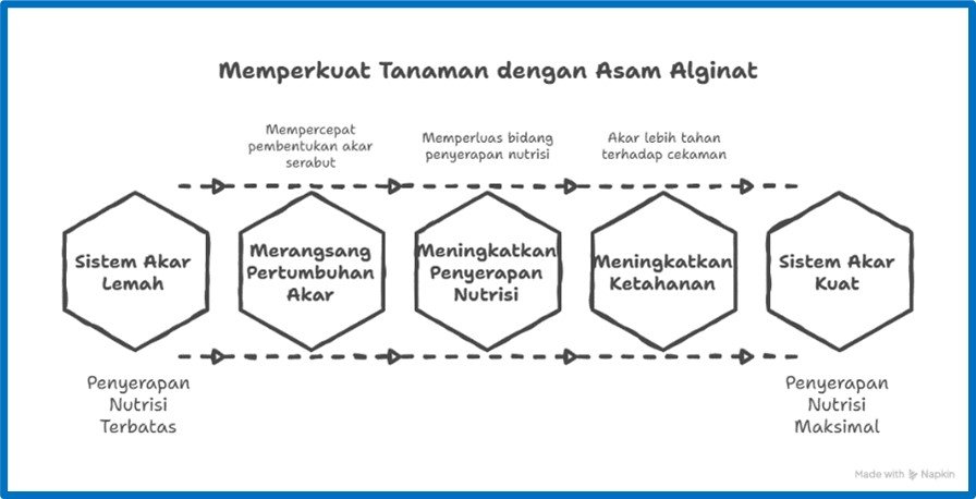 Selain itu, sifat alginat yang mengikat air juga membantu sel-sel tanaman tetap turgid (segar). Kondisi ini sangat penting agar proses metabolisme, seperti fotosintesis dan penyerapan nutrisi, tetap berjalan dengan baik. Hasilnya, tanaman mampu mempertahankan pertumbuhan dan produktivitasnya walau berada dalam kondisi cekaman lingkungan, seperti kekeringan, suhu tinggi, atau kualitas tanah yang kurang mendukung.