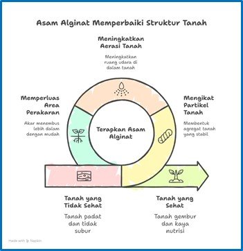 Selain berperan dalam penyediaan air dan nutrisi, asam alginat juga memberikan manfaat besar dalam memperbaiki struktur tanah. Molekul alginat mampu mengikat partikel tanah menjadi agregat yang lebih stabil. Agregat tanah yang stabil membuat tanah menjadi lebih gembur, tidak mudah memadat, dan lebih tahan terhadap erosi. Tanah yang gembur memudahkan akar menembus lebih dalam, sekaligus memperluas area perakaran untuk menyerap nutrisi dan air secara maksimal.
