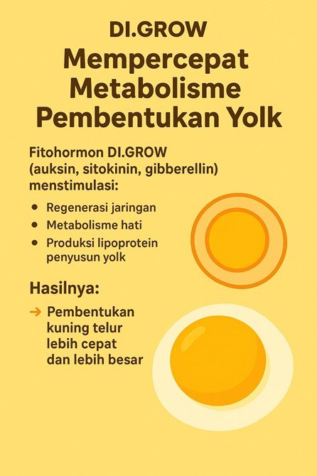Pembentukan kuning telur (yolk) adalah proses biologi yang sangat bergantung pada metabolisme tubuh ayam, terutama fungsi hati dan regenerasi jaringan folikel di ovarium. DI.GROW mengandung fitohormon alami—auksin, sitokinin, dan gibberellin—yang bekerja seperti “pemicu metabolisme” untuk mempercepat dan memperkuat proses tersebut.