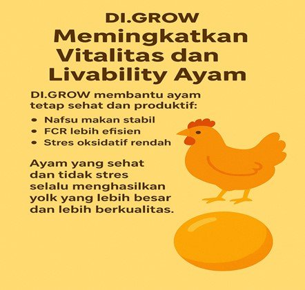 Ayam yang mengonsumsi DI.GROW memiliki: ketahanan tubuh lebih kuat, risiko penyakit lebih rendah dan stress response lebih stabil saat cuaca ekstrem, kepadatan tinggi, atau perubahan pakan. Ayam yang lebih tahan terhadap tekanan lingkungan akan memproduksi telur dengan kualitas yolk yang lebih baik, karena energi tubuh tidak terbuang untuk bertahan dari stres.