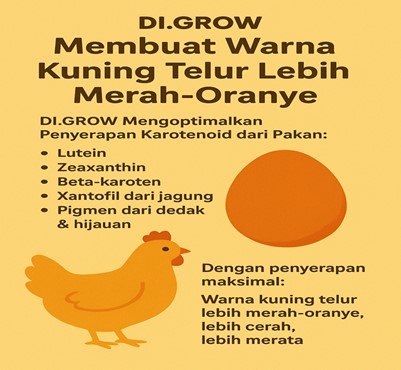 Kekuatan warna kuning telur (yolk) sangat bergantung pada jumlah karotenoid yang diserap oleh tubuh ayam. Karotenoid adalah pigmen alami yang memberikan warna kuning, oranye, hingga merah pada yolk. DI.GROW berperan penting dalam memaksimalkan penyerapan karotenoid dari berbagai sumber pakan sehingga warna kuning telur menjadi lebih tajam dan lebih stabil.