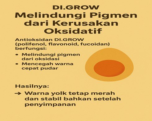 Warna kuning telur (yolk) yang cerah, merah-oranye, dan stabil sangat ditentukan oleh kondisi pigmen karotenoid di dalam telur. Masalah terbesar pada pigmen adalah oksidasi, yaitu proses kerusakan yang disebabkan oleh radikal bebas. Oksidasi membuat warna kuning telur menjadi pucat, cepat pudar, dan tidak stabil selama penyimpanan. DI.GROW mengandung antioksidan kuat—polifenol, flavonoid, dan fucoidan—yang bekerja secara langsung melindungi pigmen tersebut agar tetap utuh dan berwarna kuat.