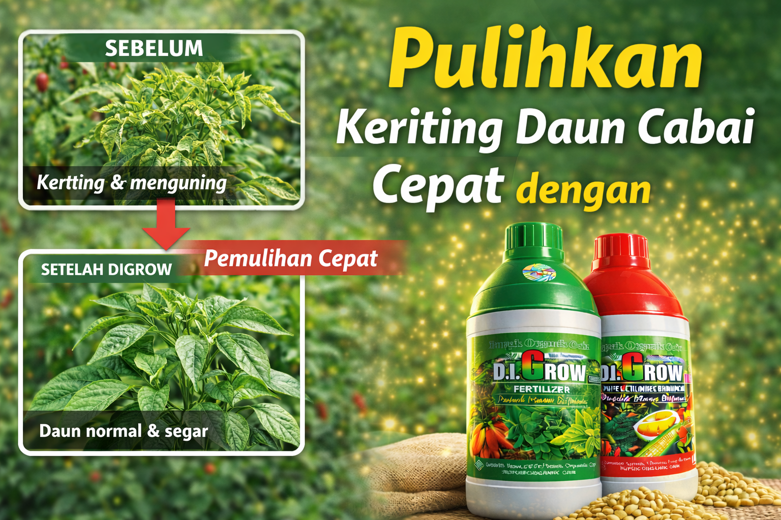 Keriting daun menyebabkan gangguan fotosintesis, pertumbuhan terhambat, serta penurunan pembentukan bunga dan buah. Selain pengendalian hama vektor, pendekatan pemulihan fisiologis tanaman melalui pemberian nutrisi lengkap dan biostimulan alami menjadi strategi penting untuk mempercepat recovery tanaman.