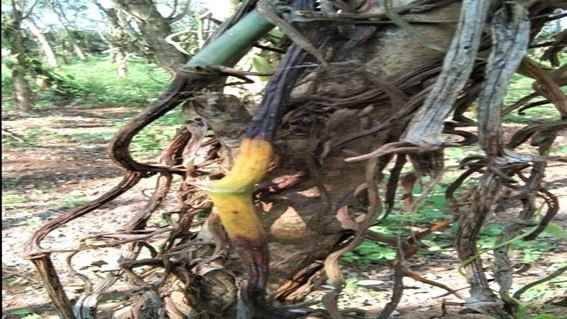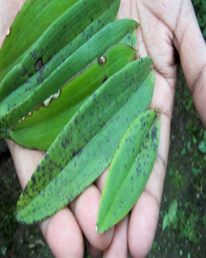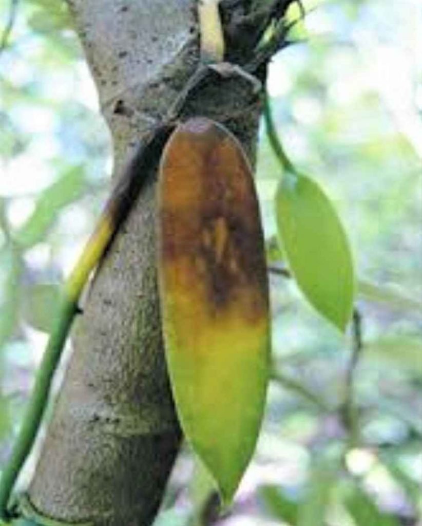 Penyebab: jamur Calospora vanillae, Mass. Gejala: batang, daun, buah berwarna coklat muda kekuningan tampak licin dan terlihat jelas bagian terserang. Pengendalian: Potong dan bakar bagian terserang, atur kelembaban dan drainase. Semprot dgn fungisida bahan aktif mandipropamid.