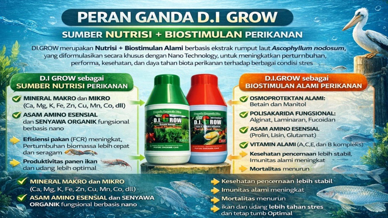 D.I GROW hadir sebagai inovasi penting dalam sistem perikanan dan akuakultur modern yang berkelanjutan. D.I GROW merupakan Nutrisi sekaligus Biostimulan Alami berbasis ekstrak rumput laut Ascophyllum nodosum, yang diformulasikan secara khusus dengan Nano Technology , untuk meningkatkan pertumbuhan, performa, kesehatan, dan daya tahan biota perikanan terhadap berbagai kondisi stres lingkungan perairan.