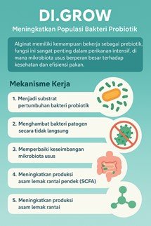Bakteri seperti Lactobacillus dan Bacillus menggunakan alginat sebagai sumber karbon dan energi. Ini meningkatkan ketersediaan nutrisi mikroba, mendorong kolonisasi bakteri baik secara cepat. Ketika bakteri probiotik berkembang, ruang kolonisasi di usus semakin terbatas untuk bakteri patogen (contoh: Aeromonas, Vibrio). Bakteri baik juga menghasilkan metabolit antimikroba yang dapat menekan patogen. Usus ikan yang seimbang mikrobiotanya akan lebih efisien dalam mencerna pakan, memiliki sistem imun lebih kuat, dan lebih tahan terhadap infeksi. Hasil fermentasi probiotik (seperti asetat, propionat, butirat) memperkuat imunitas lokal usus dan menunjang fungsi metabolisme ikan.