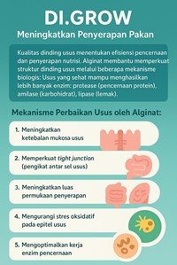 Dengan mengurangi radang usus dan kerusakan vili, permukaan penyerapan meningkat sehingga absorpsi pakan (protein, karbohidrat, lipid, mineral) menjadi lebih optimal. Alginat memiliki aktivitas antioksidan moderat yang melindungi sel-sel usus dari kerusakan oksidatif yang umum terjadi pada budidaya intensif. Usus yang sehat mampu menghasilkan lebih banyak enzim: protease (pencernan protein), amilase (karbohidrat), lipase (lemak). Hasil akhirnya adalah peningkatan FCR dan pertumbuhan ikan.