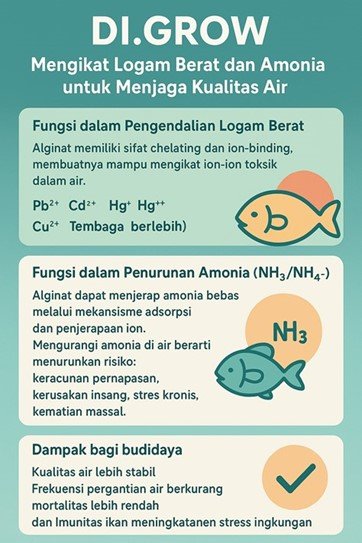 Alginat dapat menjerap amonia bebas melalui mekanisme adsorpsi dan penjerapan ion. Mengurangi amonia di air berarti menurunkan risiko: keracunan pernapasan, kerusakan insang, stres kronis, kematian massal. Alginat juga membantu mikroorganisme nitrifikasi (Nitrosomonas dan Nitrobacter) berkembang, karena lingkungannya menjadi lebih stabil. Kualitas air lebih stabil, Frekuensi pergantian air berkurang, mortalitas lebih rendah dan Imunitas ikan meningkat karena stres lingkungan menurun.